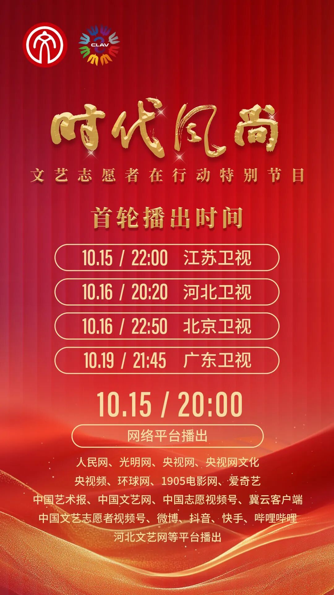 由中国文联、中国文艺志愿者协会主办的“时代风尚——文艺志愿者在行动特别节目”将于10月15日20:00在人民网、光明网、央视网、央视网文化、央视频、环球网、1905电影网、爱奇艺、中国艺术报、中国文艺网、中国志愿视频号、冀时客户端、中国文艺志愿者视频号、微博、抖音、快手、哔哩哔哩等新媒体平台同步直播。北京卫视、河北卫视、江苏卫视、广东卫视等卫视频道陆续播出。欢迎届时收看!