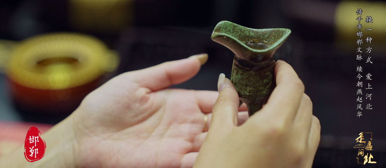 这个酒杯叫做“爵”,是古时候用的一种酒器,宽口称之为“流”,尖口称之为“尾”,是按照邯郸博物馆的镇馆之宝“金银涂乘舆大爵酒樽”等比例复刻的,就连旁边的承盘,都还原了战国贵族宴饮的规制。