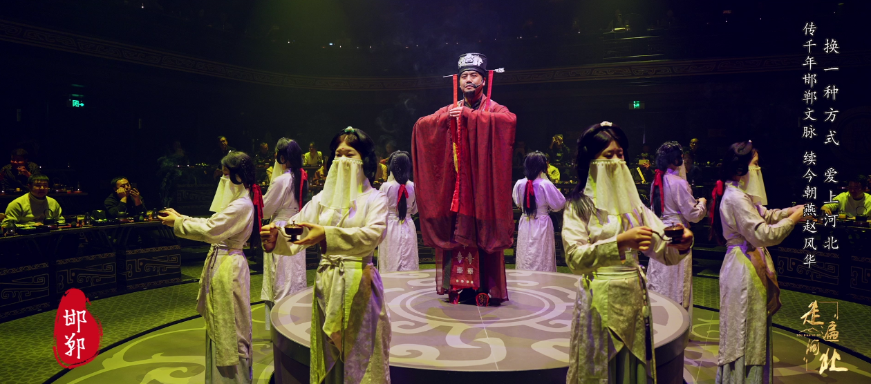 舞台上,赵武灵王、蔺相如、廉颇等历史名人穿越到此,一展战国时期赵国邯郸王城的风姿;舞台下,身着战国袍的工作人员穿梭其间,不时与宾客互动;营造出沉浸式的环境体验,让游客穿越时空,感受邯郸三千年的历史。