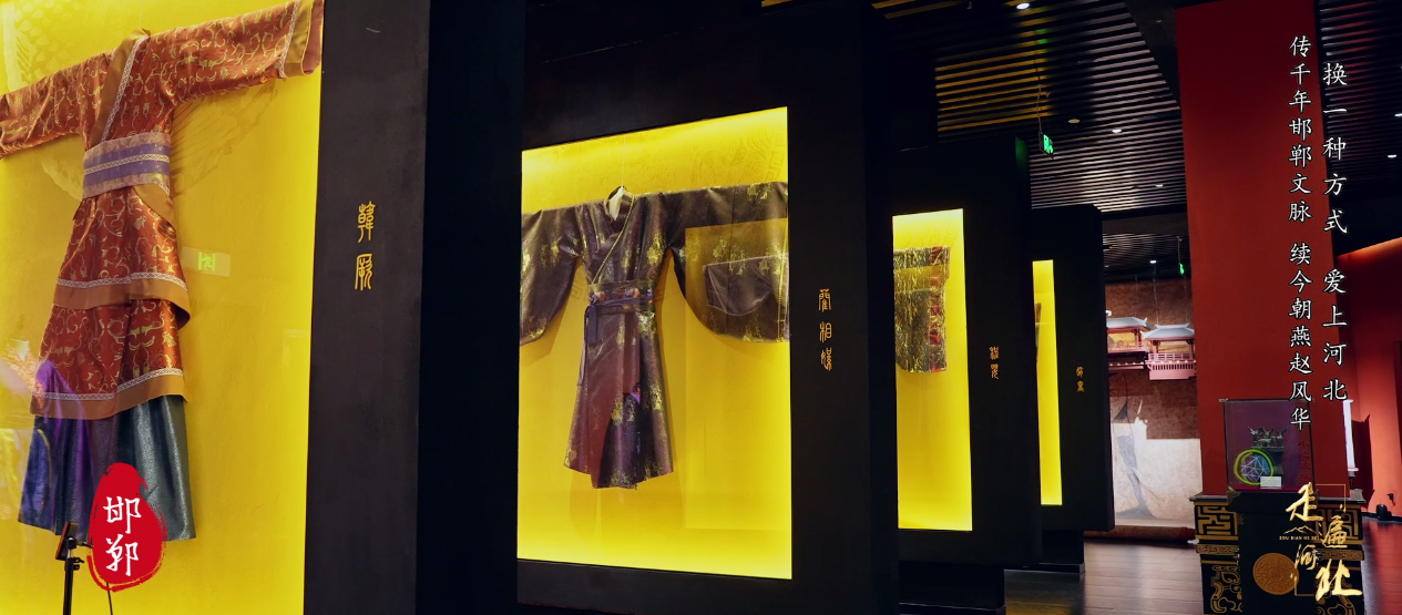 我们的一楼大厅专门打造了一个战国袍博物馆,陈列了一百多件春秋战国时期的服饰。同时我们还在一楼融入了邯郸成语文化,还包括建筑、兵器、车马等等元素,也可以供我们游客去打卡参观。