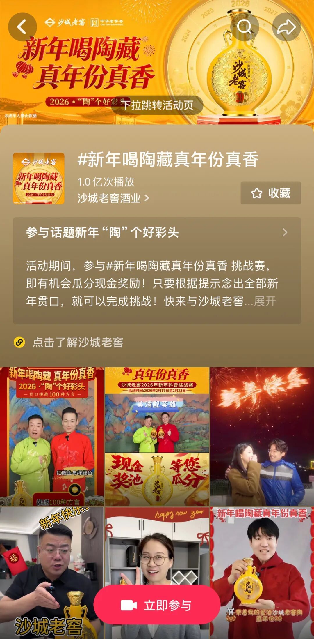 线上传播矩阵中,沙城老窖面向B端合作伙伴与C端消费者,分别启动了“新年好彩头”短视频共创大赛、“我家的年夜饭”视频征集活动及“抖音方言贯口挑战赛”。其中抖音挑战赛成为引爆全民参与的“炸点”,话题播放量已突破1亿次,形成了一定规模的UGC传播势能。