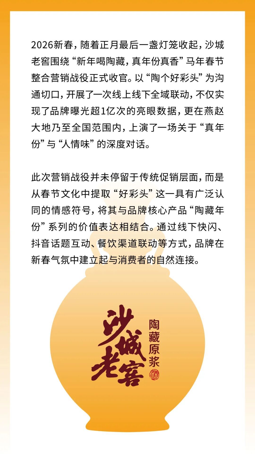 本次“陶个好彩头”春节营销活动,沙城老窖以“真年份真香”为价值锚点,通过“媒体造势+场景体验+内容共创+促销转化”的四维联动,成功将品牌文化与传统年俗深度融合,不仅实现了品牌声量的全域覆盖,更以创新玩法激活了老酒品类的新春消费活力,为区域白酒品牌的春节营销提供了可借鉴的范式。未来,沙城老窖将继续深耕真年份老酒,以文化赋能品牌,以品质赢得市场。