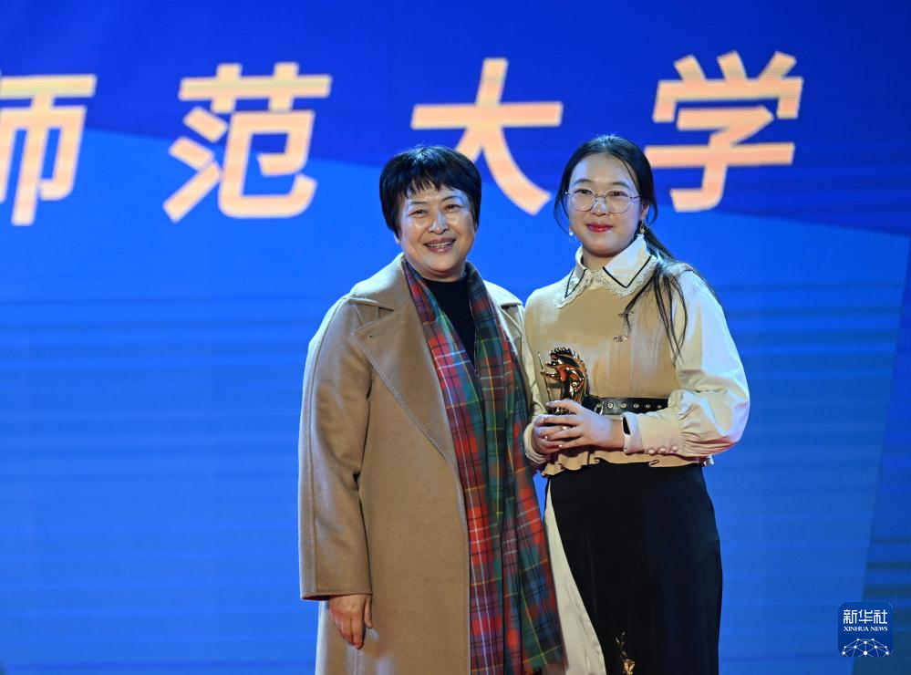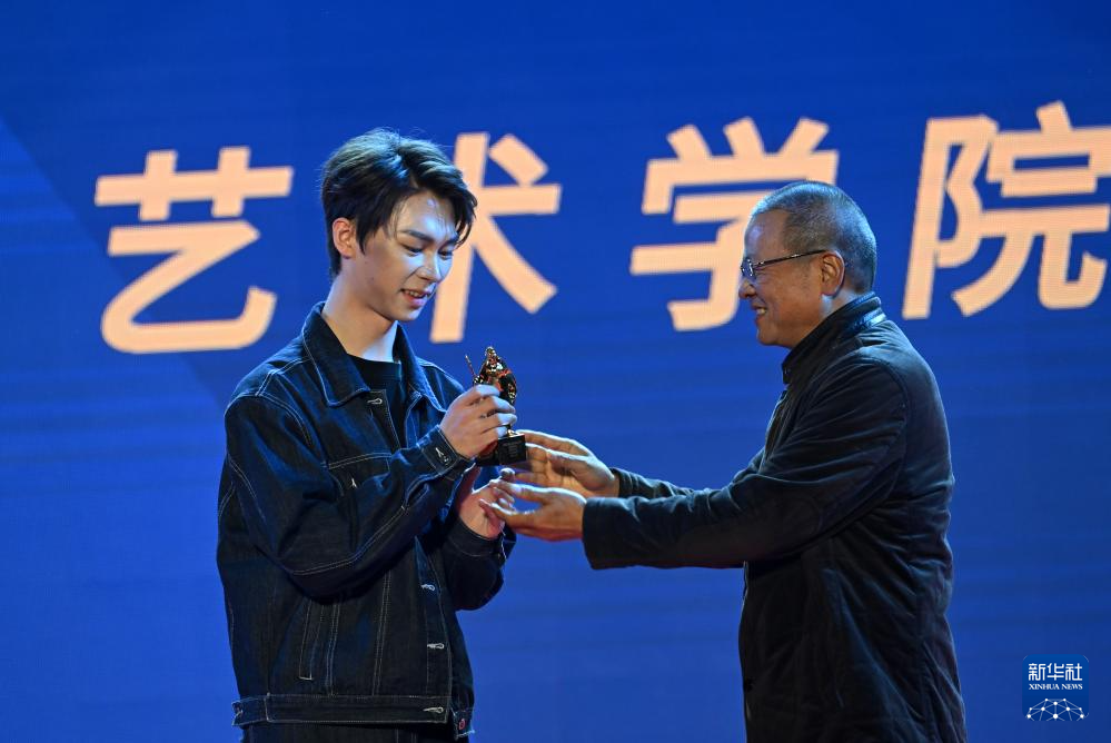 北京戏剧家协会副主席王宝社(右)为获得微短剧单元“微短剧之星”的西南民族大学《狮·心》剧组代表颁奖