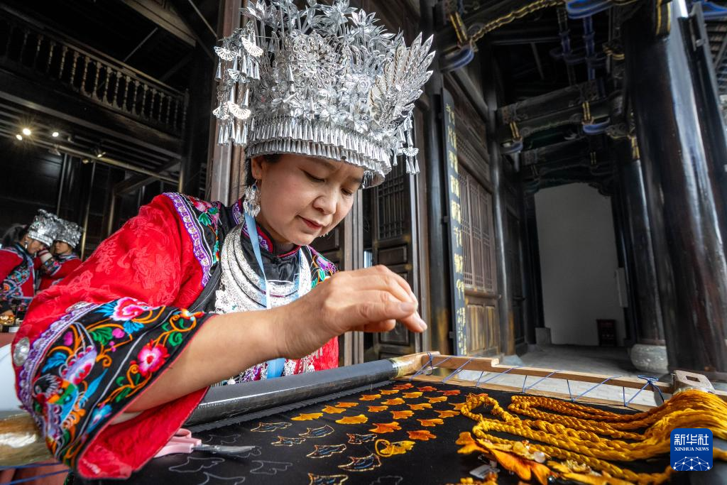 重庆酉州苗绣市级传承人陈国桃在2025非遗品牌推广周上刺绣