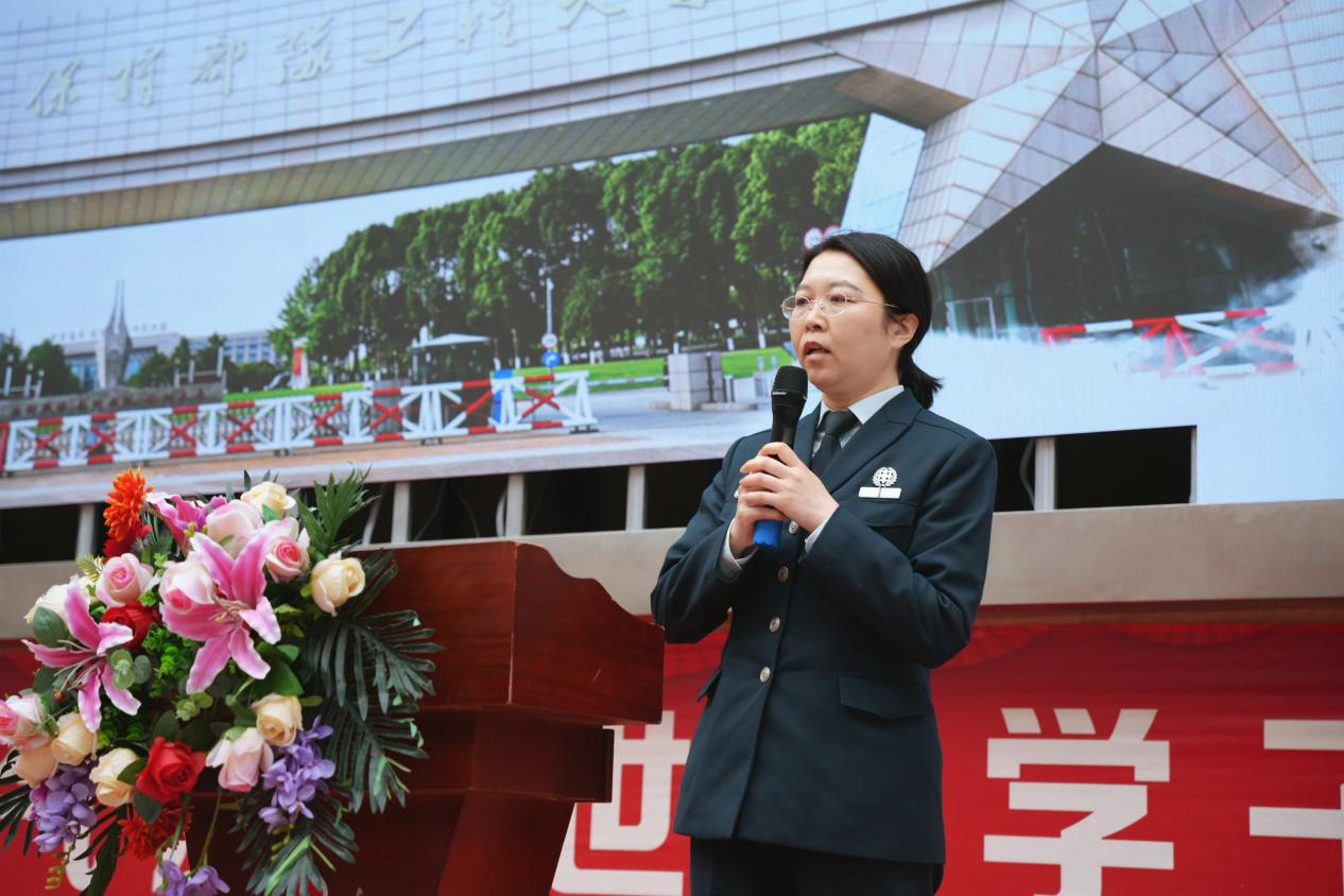 活动伊始,校长魏彦召为本次活动致辞。她首先代表学校向莅临校园的主办方及军校宣讲代表表示热烈欢迎与衷心感谢,随后强调了国防教育对于青少年成长的重要意义,指出少年强则国强,青少年是国家的未来、民族的希望,加强国防教育,既是培养学生爱国情怀、责任担当的重要途径,也是助力学子树立远大理想、锤炼优良品格的关键举措。她勉励全体学生认真聆听宣讲内容,感悟军人精神,树立国防意识,将爱国之心、报国之志融入日常学习生活,努力成长为有理想、有本领、有担当的新时代青少年。致辞饱含深情,既传递了学校对国防教育工作的重视,也激发了同学们参与活动的热情。