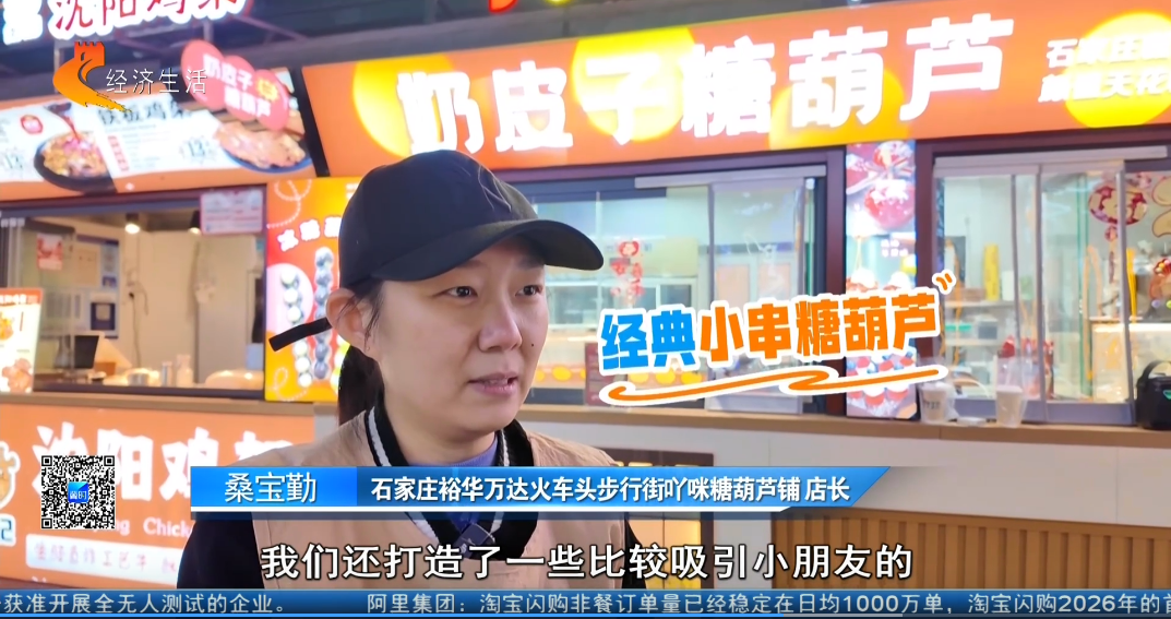 石家庄裕华万达火车头步行街吖咪糖葫芦铺 店长 桑宝勤:除了奶皮子糖葫芦之外,我们还打造了一些比较吸引小朋友的经典小串儿糖葫芦。有奶皮子款的干椰酸奶款的,还有固体杨枝甘露,还有棉花糖款,同时带动了门店的整体客流。后续,我们也准备打算制作一些更有特色的糖葫芦,比如说巧克力脆皮糖葫芦。
