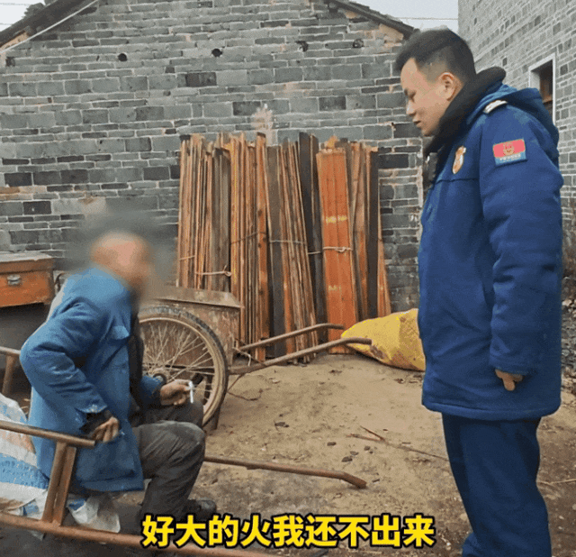 在大爷向消防员介绍情况时