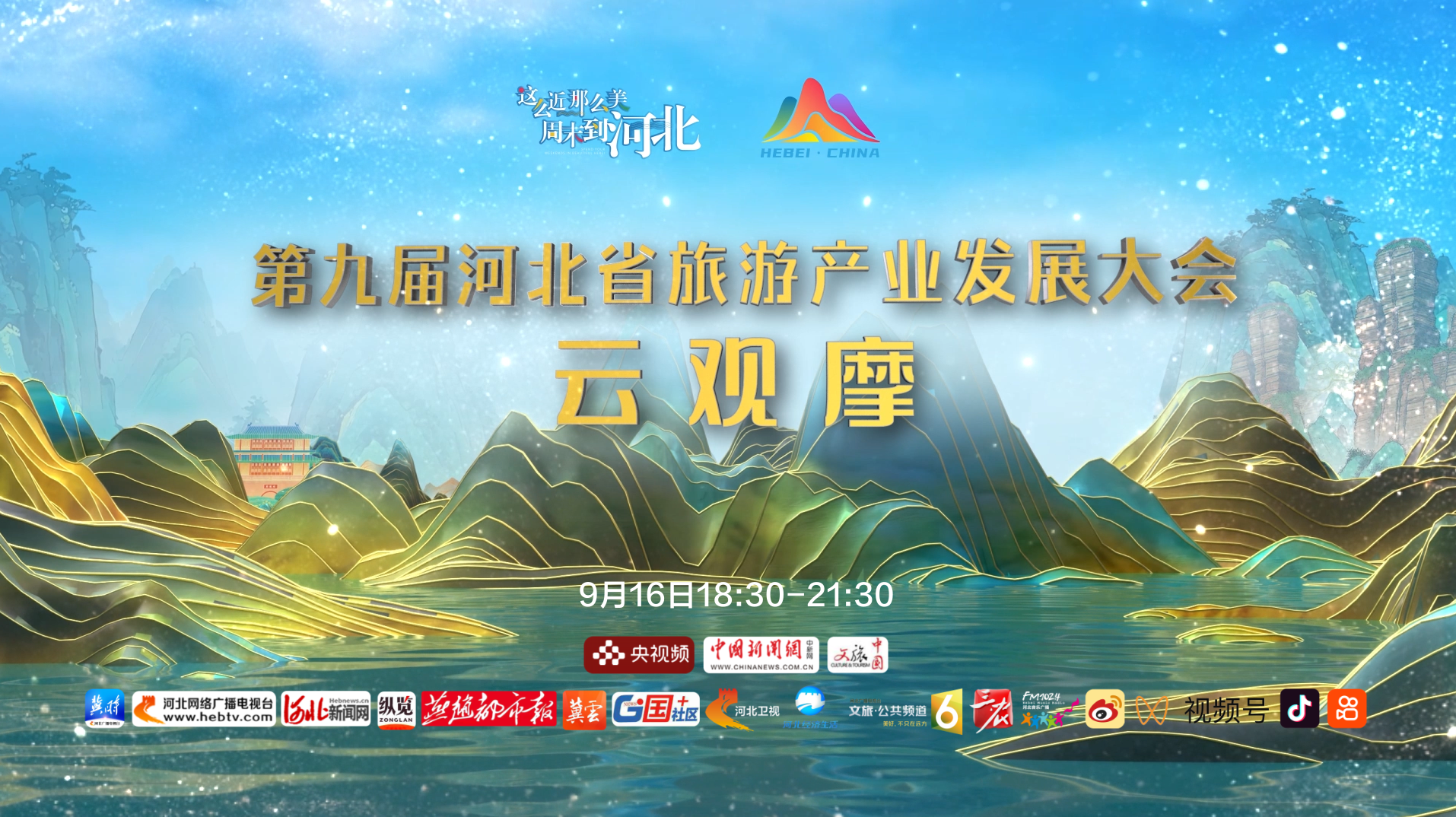 9月16日 18:30,河北广播电视台联合河北省文化和旅游厅,推出第九届河北省旅游产业发展大会云观摩直播活动。第九届河北省旅游产业发展大会,以“这么近,那么美,周末到河北”为主题,以“太行山文化旅游带”建设为牵引,采用“主分会场联动”模式,主会场设在邢台市,石家庄、张家口、保定、邯郸市设分会场。今天的云观摩直播活动中,河北广播电视台全媒体演播室、旅发大会主会场现场演播室,双演播室云端对话、五地联动全景呈现、21路记者深度探访、文旅专家权威解读,直击大会精彩亮点,沉浸展示重点活动。三小时的直播中,通过“壮美太行”“红色太行”“非遗太行”“活力太行”四个篇章,带您真切感受太行魅力和河北文旅发展的新成果,解锁“这么近,那么美,周末到河北”的品牌价值密码。