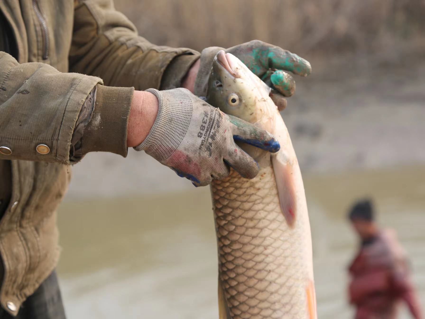 村民喜获丰收,高兴地展示捕捞的鱼。