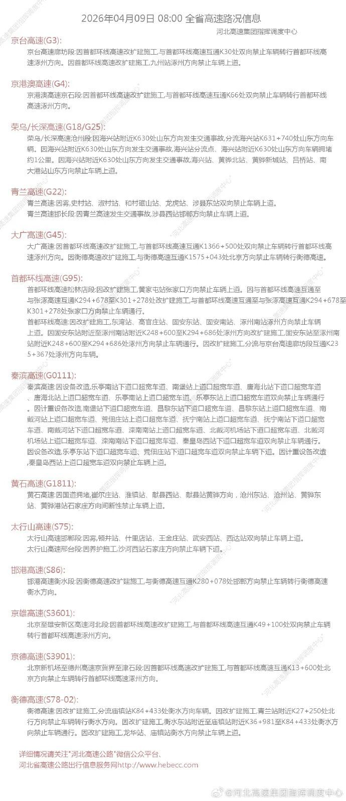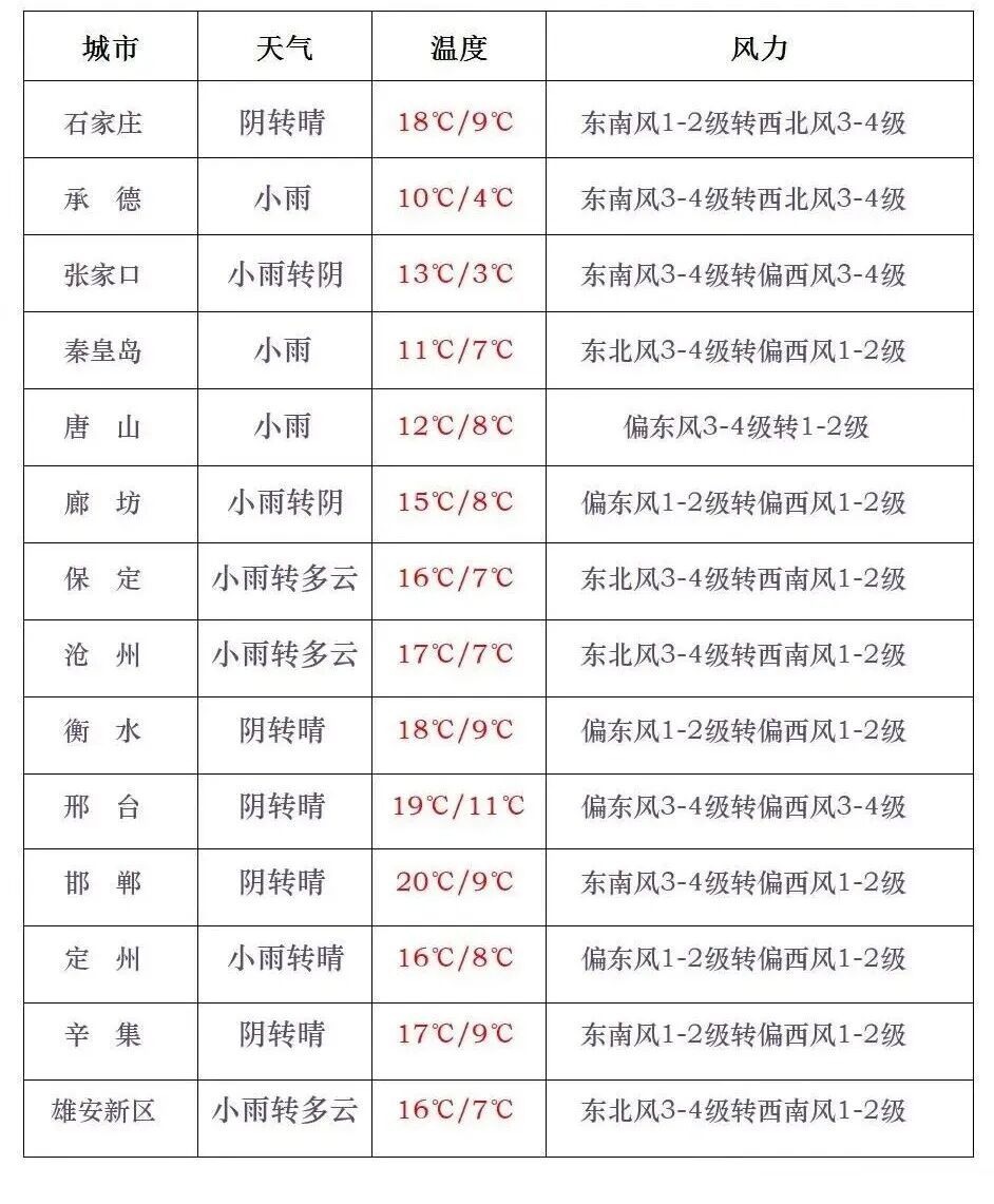 河北省气象台2026年04月09日05时发布天气预报:今天白天,石家庄、衡水、邢台、邯郸多云,坝上地区阴有雨夹雪,其他地区阴有小雨或阵雨,其中张家口东部、承德中南部局地有中雨。今天早晨,保定南部、石家庄东部、衡水西部、邢台、邯郸的部分地区有雾。最高气温,张家口北部、承德、秦皇岛1~12℃,其他地区13~26℃。今天夜间,张家口东部、承德、唐山、秦皇岛、廊坊北部阴有小雨或零星小雨转多云,其他地区多云转晴。最低气温,张家口北部、承德北部-5~4℃,其他地区5~12℃。明天白天到夜间,全省晴间多云。11日白天到夜间,全省晴间多云。10日白天,张家口、承德、保定西北部有西北风4到5级,阵风6到7级,局地可达8级。编辑 杨漂亮 编审 王婷婷 监制 冯迎晖