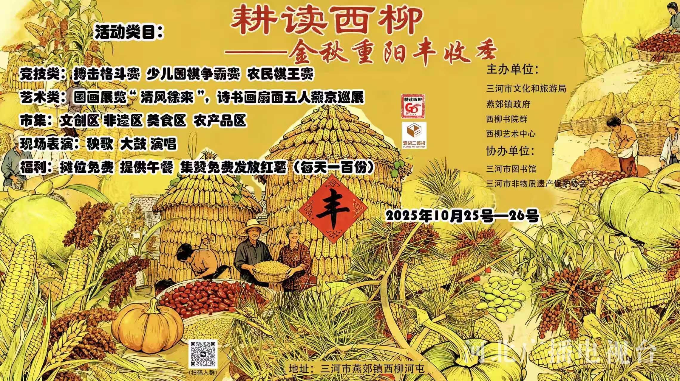 冀时客户端报道(河北台 李春霞 王亮 通讯员 卢士杰 王娇)金秋十月,稻谷飘香。为期两天的“耕读西柳·金秋重阳丰收季文化节”活动将于10月25日在廊坊三河市西柳镇启幕。本次活动旨在深度挖掘乡土文化内涵,融合传统重阳敬老之意与欢庆丰收之喜,为市民游客打造集观赏、体验、消费、娱乐于一体的秋日文化盛宴。