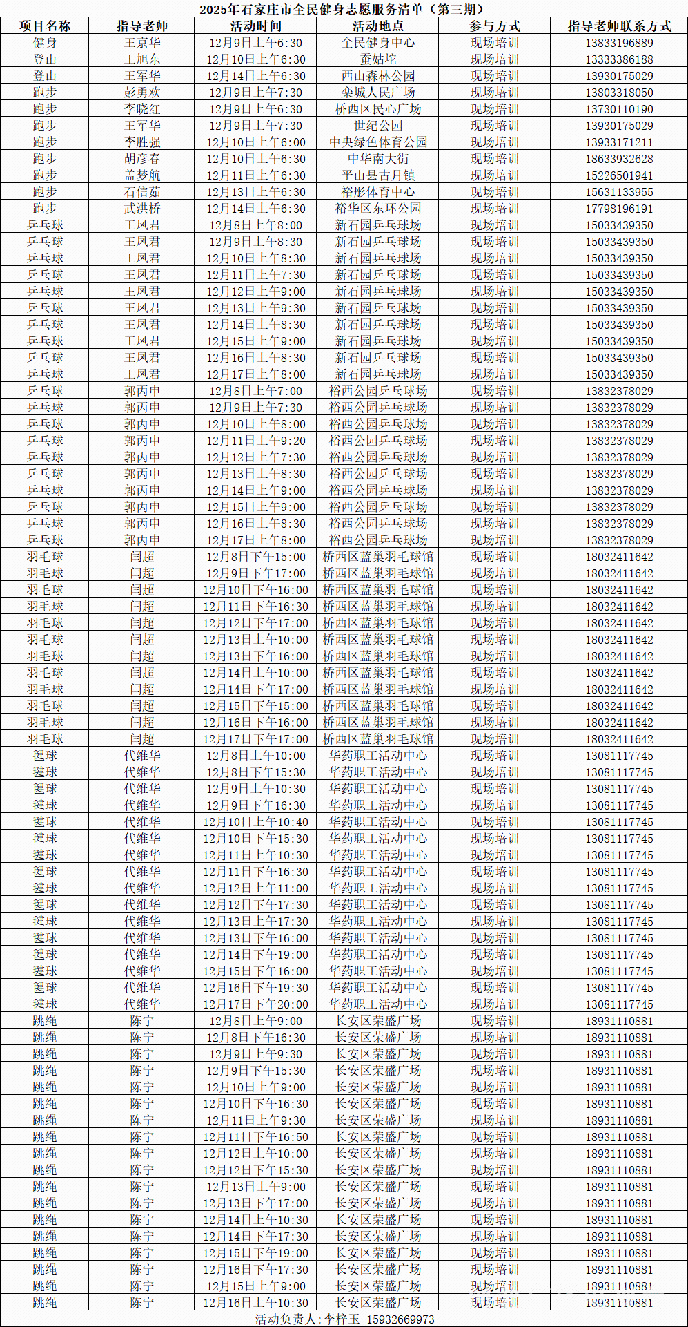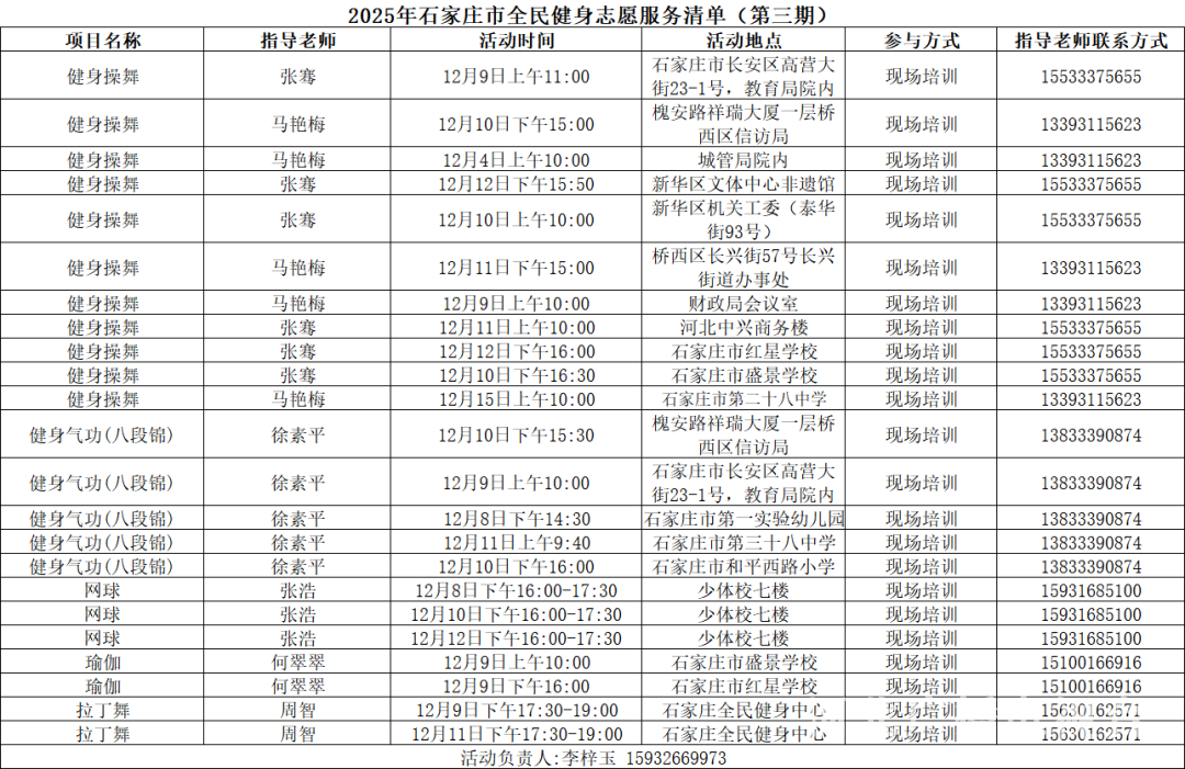 冀时客户端报道(河北台 杜岩卿 通讯员 杨海慧)12月9日,2025年石家庄市全民健身志愿服务第三批100场清单正式发布。