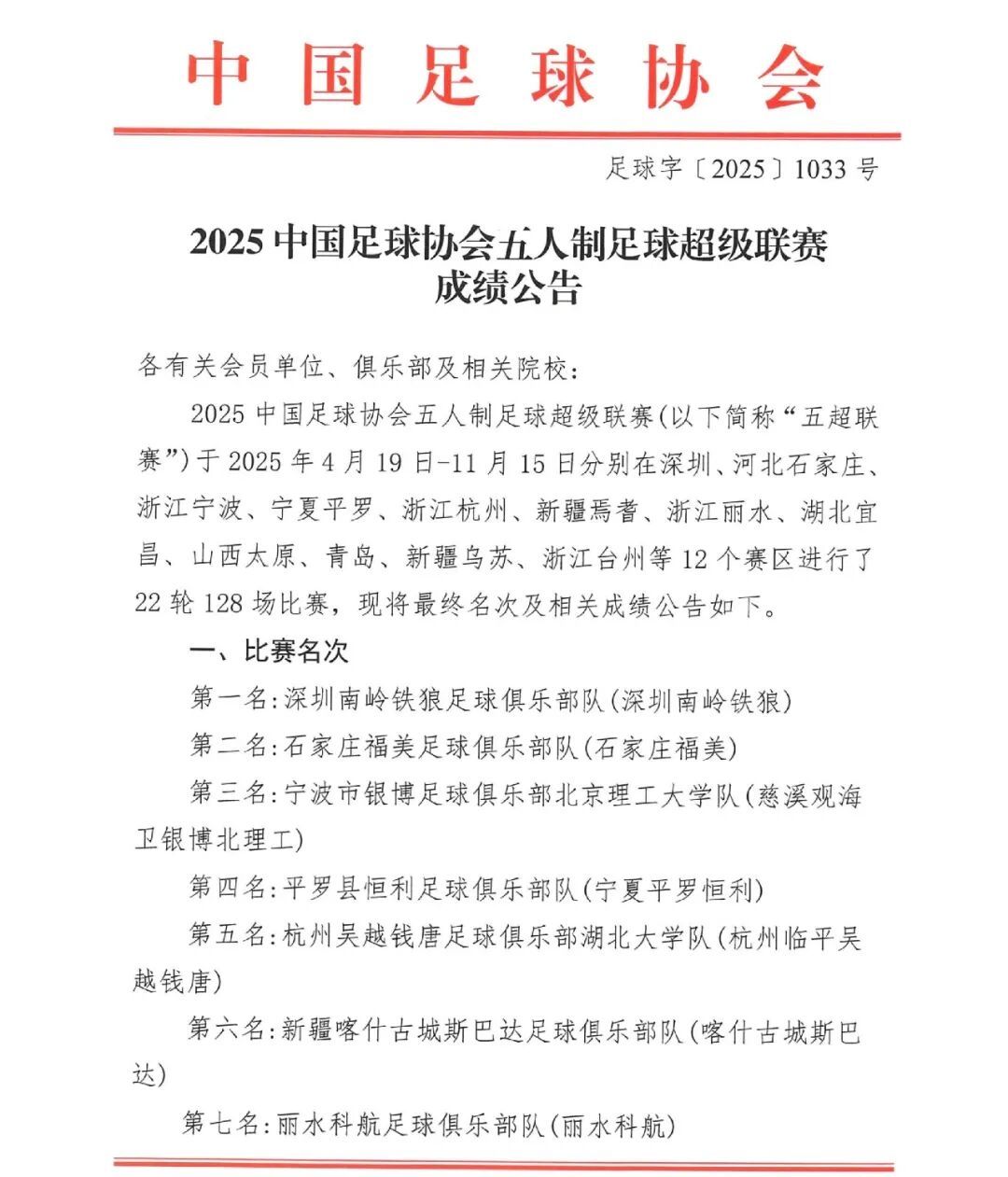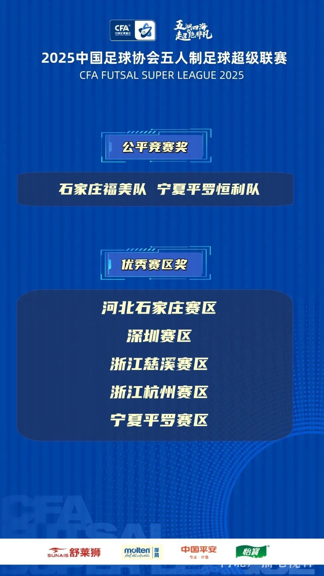 冀时客户端报道(河北台 杜岩卿 通讯员 杨海慧)12月10日,中国足协公布2025中国足球协会五人制足球超级联赛的各奖项名单,石家庄福美斩获联赛亚军,并获得公平竞赛奖。石家庄赛区连续三年获得优秀赛区奖;石家庄赛区协调员童超获得优秀赛区协调员奖。