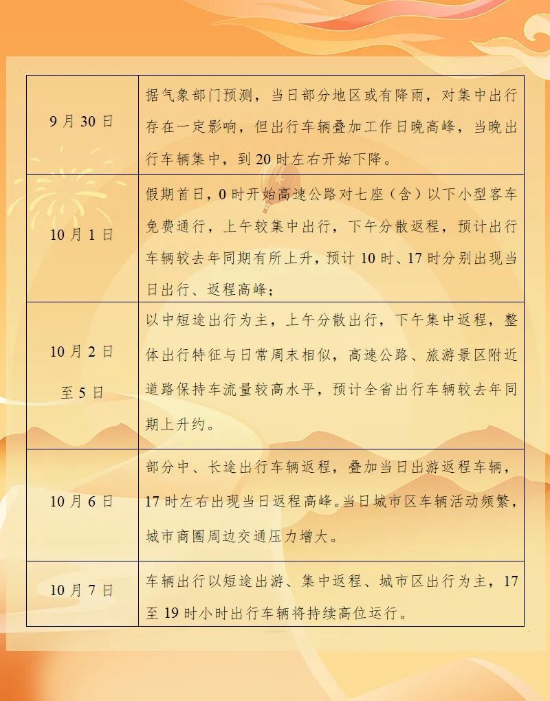 2024年国庆假期为10月1日至7日(共7天),高速公路对7座及以下小型客车继续实施免费通行政策。假期期间,省内旅游市场火爆,车辆出行以各大景区、旅游城市为目的地中长途出行为主,预计日均出行车辆达到1500万辆以上,每日呈分散出行集中返程特点,出行高峰时段出行时间集中在8至11时和16至19时。