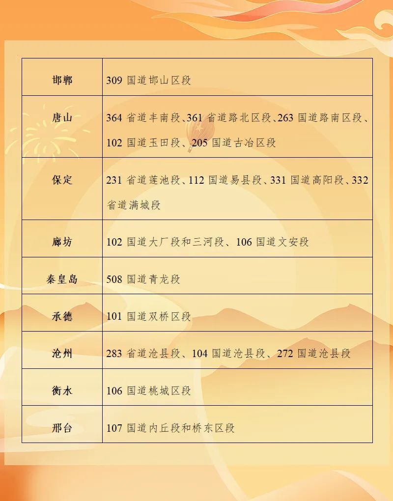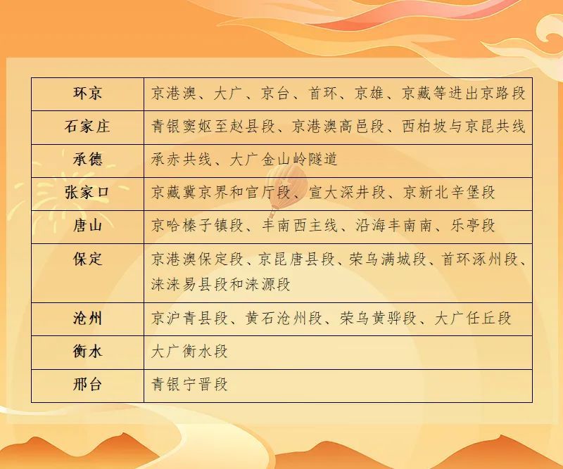 高速公路方面:预计今年国庆假期全省高速路网日均流量将同比去年同期增长,环京津、环省会、热门景区周边站口车辆集中通行,易出现缓行情况。重点关注路段主要有: