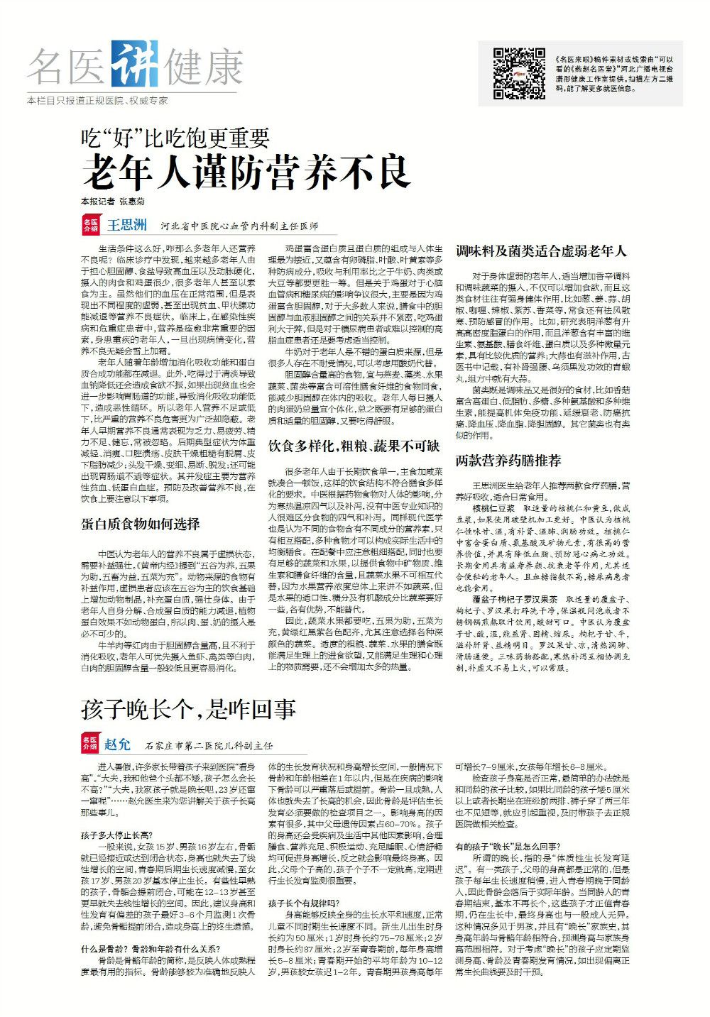 生活条件这么好,咋那么多老年人还营养不良呢?临床诊疗中发现,越来越多老年人由于担心胆固醇、食盐导致高血压以及动脉硬化,摄入的肉食和鸡蛋很少,很多老年人甚至以素食为主。虽然他们的血压在正常范围,但是表现出不同程度的虚弱,甚至出现贫血、甲状腺功能减退等营养不良症状。临床上,在感染性疾病和危重症患者中,营养是痊愈非常重要的因素,身患重疾的老年人,一旦出现病情变化,营养不良无疑会雪上加霜。