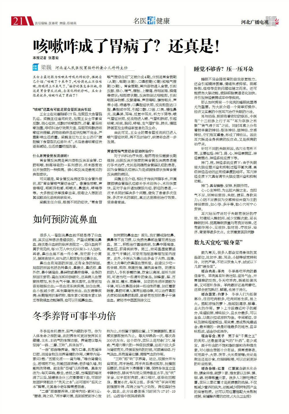 梁巍主任介绍,根据不同的症状,“胃食管喉气管综合征”又被分成4期,分别是胃食管期(A期)、咽期(B期)、口鼻腔期(C期)和喉气管期(D期)。胃食管期,胃内容物进入食管,引起反酸、烧心、嗳气、腹胀、上腹痛、吞咽困难、胸痛等症状;咽部症状期,反流物到达咽喉部,引起咽部异物感、反复清嗓、声音嘶哑、慢性咽炎、声带小结、喉癌等;口鼻腔症状期,反流物到达口腔、鼻腔或中耳,引起口酸、口苦、口臭、慢性鼻炎、流鼻涕、耳鸣、反复中耳炎、听力下降等;喉气管症状期,反流物进入喉、气管和肺部,引起咳嗽、咳痰、胸闷、哮喘、支气管扩张、肺炎、慢阻肺甚至发生喉痉挛窒息危及生命。