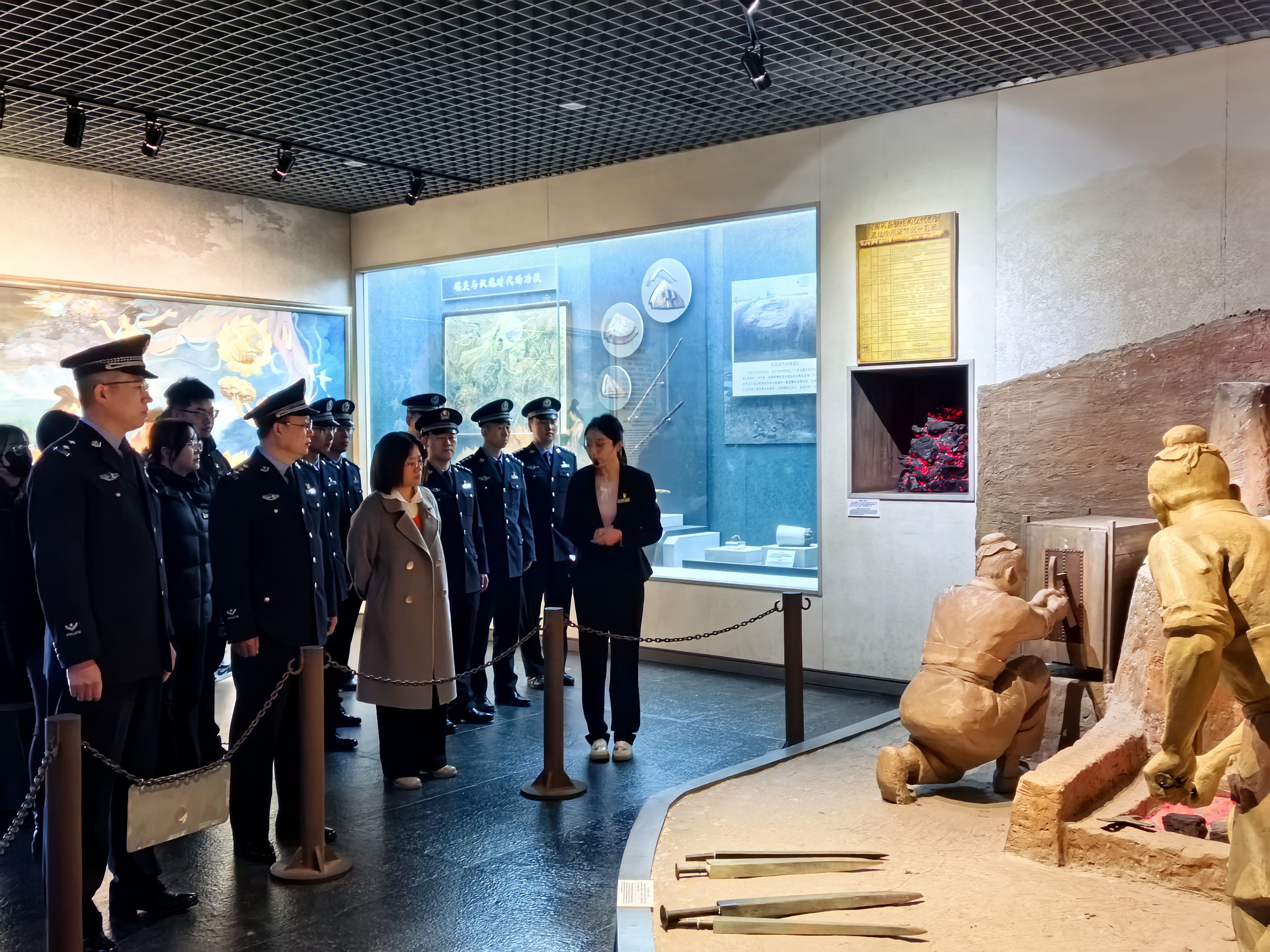 在地下矿井展区,潮湿空气与昏黄灯光扑面而来,仿佛诉说着往昔的岁月。青年党员们沿着蜿蜒矿道前行,目光被采煤工具和斑驳巷道吸引,认真聆听矿业先辈艰苦创业的故事,在触摸历史中汲取精神力量,坚定守护国门的信念。