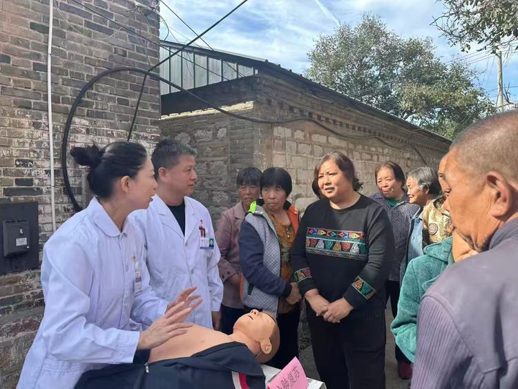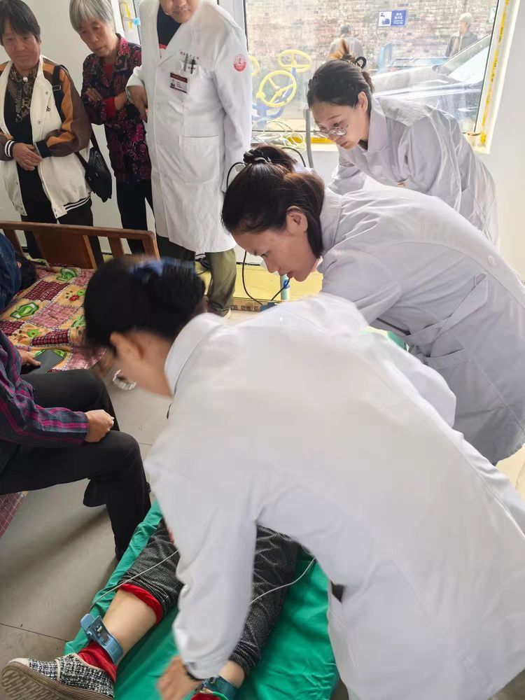 活动现场,超声医学科党支部党员与手麻心电图团队携带便携设备为村民提供免费筛查,助力疾病早发现早干预。同时,党员医护人员通过模拟人演示心肺复苏和海姆立克急救法,手把手教学,让村民掌握实用急救技能,为生命安全增添保障。