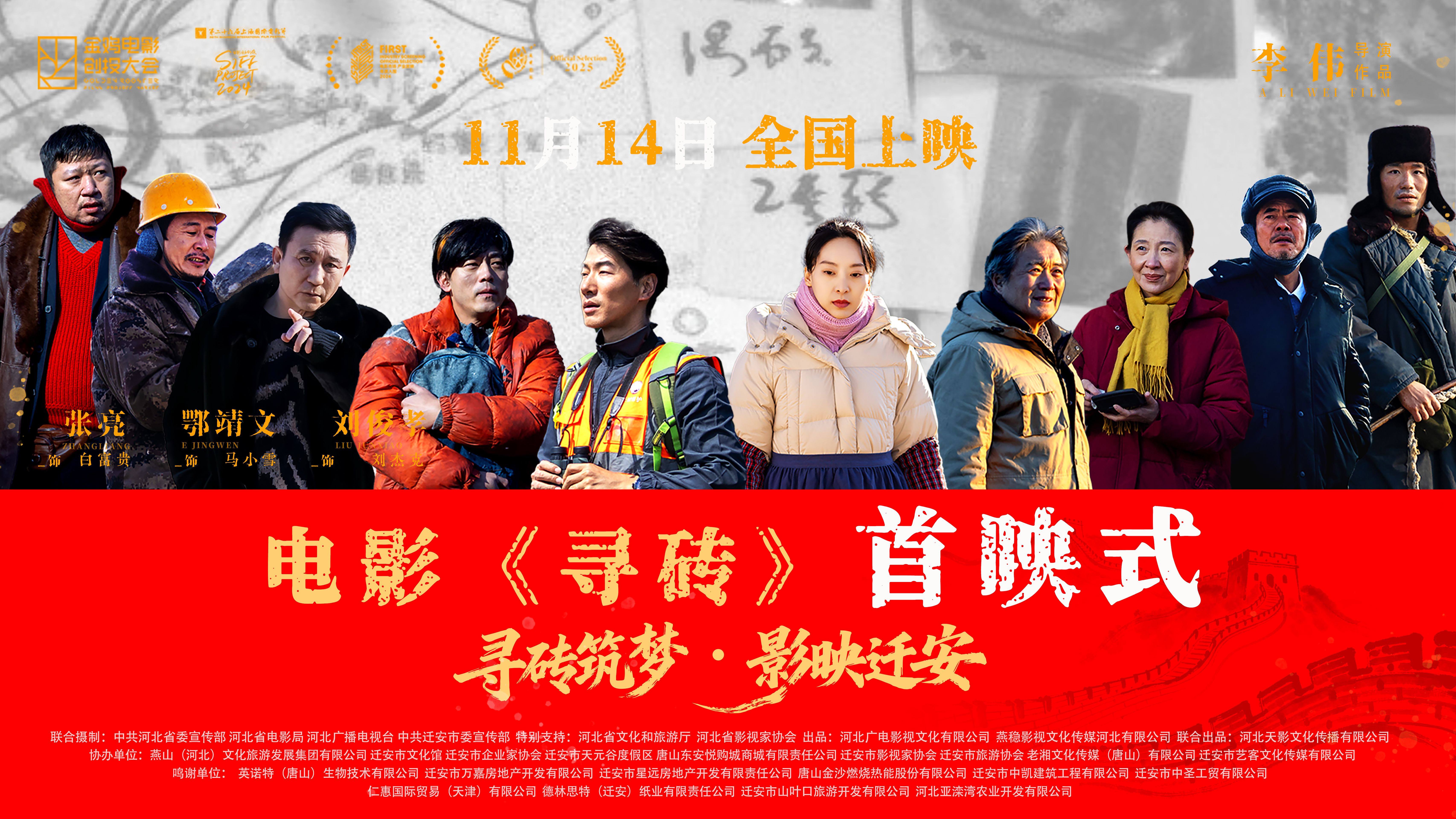 10月31日,由河北广播电视台“青年导演计划”成员李伟编剧、执导,张亮、鄂靖文、刘俊孝领衔主演的电影《寻砖》在河北迁安举办了全国首映式。该片是一部响应习近平总书记“长城文化”指示精神的作品,以“长城”为切入点,围绕“保护长城”与“发展经济”的矛盾展开,讲述了长城保护员白富贵(张亮饰演)为了寻找自己藏在砖里的求婚戒指,踏上寻砖之路的故事。在寻砖的过程中,白富贵意外发现一块刻有抗日烈士姓名的长城砖,由此揭开了一段悲壮的抗战历史,白富贵也因此找到了守护长城的意义。