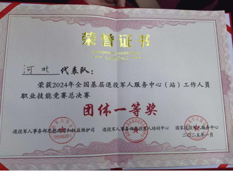 1月10日,2024年全国基层退役军人服务中心(站)工作人员职业技能竞赛总决赛在北京举办。河北代表队以绝对优势,荣获团体一等奖(第一名),队员孙林林荣获个人二等奖,队员朱小欢荣获个人三等奖。