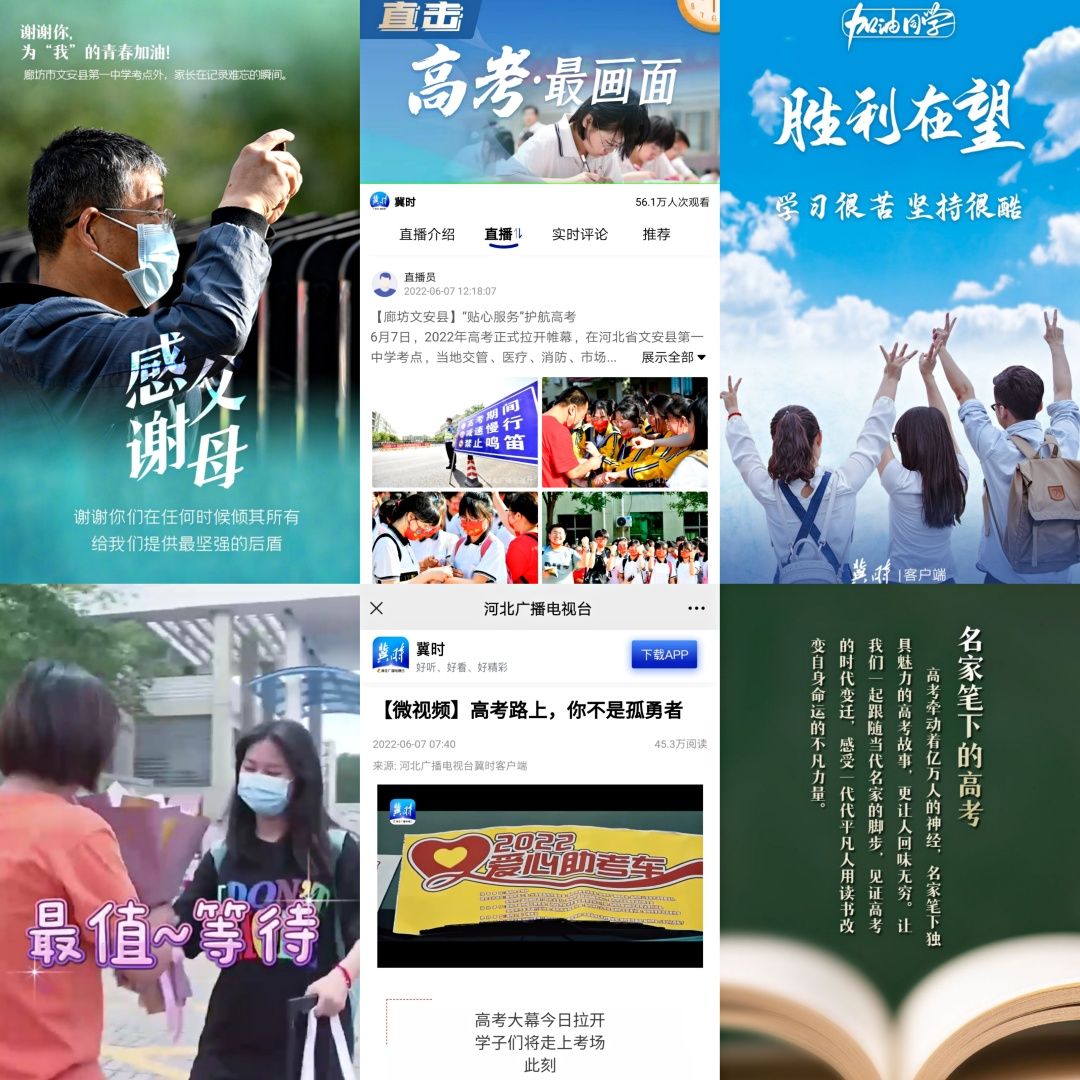 新媒体中心开设专题《关注2022年高考》,集纳全网和我台(集团)重点稿件125篇;策划推出《又到一年高考时 重温习近平总书记的青春寄语》《高考路上,你不是孤勇者》《直击2022高考那些让人泪目的暖心瞬间》《决胜高考 致敬青春》《名家笔下的高考》等10余组海报、图文和短视频;开设“冀时大直播”——《直击高考 最画面》,发布超过50篇图文报道,全景展现我省各地的考场内外情况。