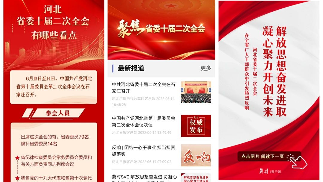新媒体中心搭建专题《聚焦省委十届二次全会》,集纳全会消息、决议和反响报道,制作推出《省委十届二次全会有哪些看点》《解放思想奋发进取 凝心聚力开创未来——省委十届二次全会在全省广大干部群众中引发热烈反响》《在解放思想中统一思想 在奋发进取中开创未来》《走县区 看产业|小螺丝如何成就永年大产业》等一大批原创新媒体产品,解读全会精神,创新呈现我省干部群众深入学习贯彻全会精神,解放思想谋发展、奋发进取开新局的精神面貌。
