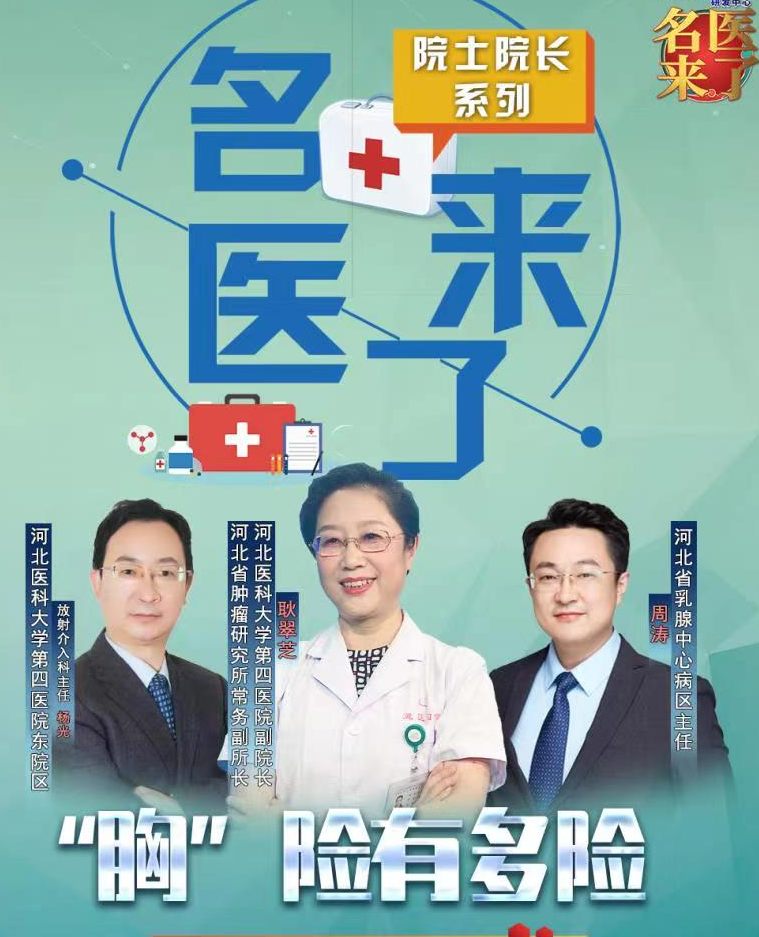 都市频道《名医来了》节目近期推出“院士”“院长”系列策划,本周,邀请河北医大四院副院长、乳腺中心权威专家耿翠芝及团队做客直播间,关注女性朋友身体健康,“冀时”客户端同步直播,参与人数超过10万。