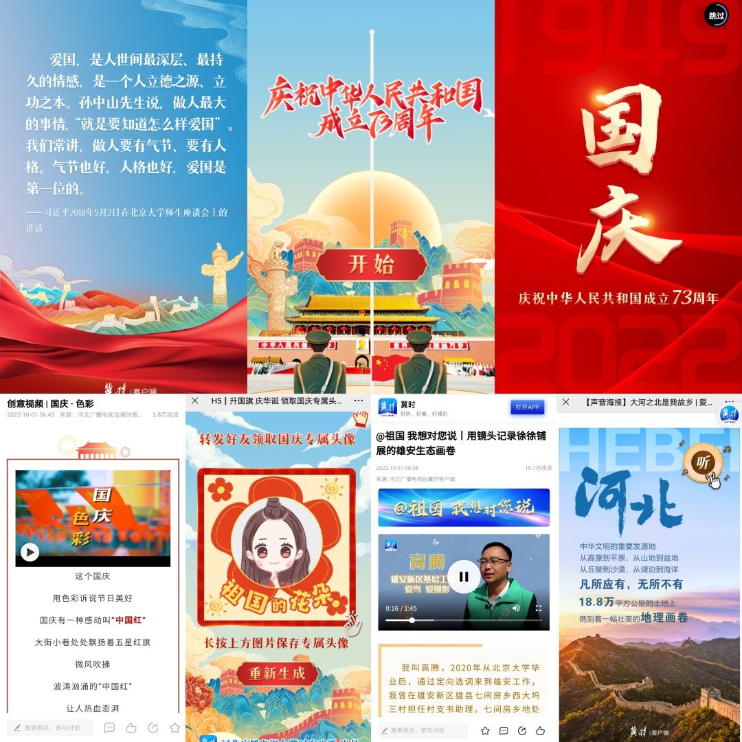 《河北新闻联播》节目推出7集国庆特色海采报道,反映燕赵儿女点赞新时代、感恩共产党的真情实感。同时,做好“共祝祖国好、奋进新时代”“我爱的十年”等系列报道,营造欢乐祥和、昂扬奋进的节日氛围。