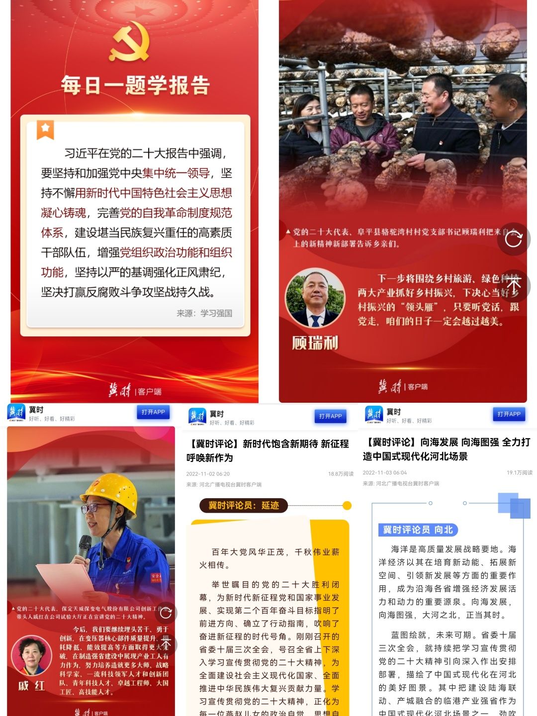 近期,新媒体中心以“全面深入学习宣传贯彻党的二十大精神”“中国式现代化河北场景”等多个专题,集纳央媒、省媒及台(集团)重点报道。同时,推出《河北:做强特色产业 赋能乡村振兴》《推动党的二十大精神在燕赵大地落地见效》等10余篇稿件,以图文海报、SVG等形式,展现全省干部群众深入学习宣传贯彻党的二十大精神的生动实践。