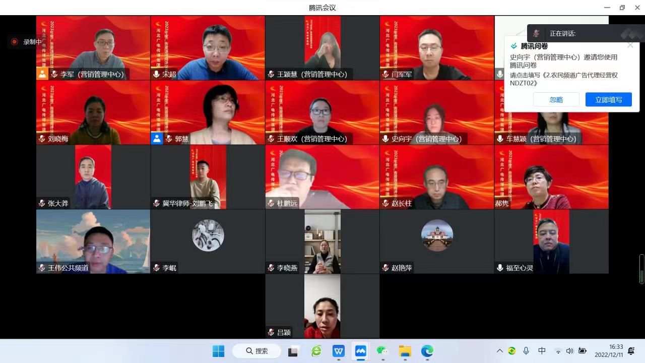 12月11日,台(集团)召开2023年度第一轮广告招商线上综合评议会,运用文件加密、在线解密、网络投票、远程监督等方式,对新闻频率群、交通频率群、农民频道的13个专题和行业代理项目进行了评审,实现招商金额7903万元。副总经理刘晓梅参加。