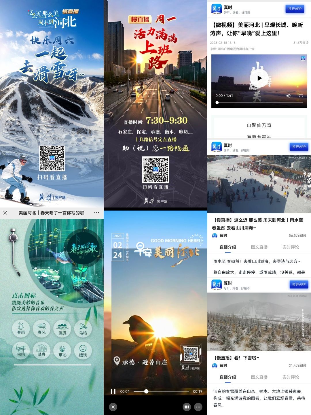 《美丽河北》慢直播结合时间节点,策划推出《周一•活力满满上班路》《二月二•山海关老龙头 龙狮起舞庆春回》《周五•快乐下班路》等多场特色直播;发布图文、短视频稿件《春光作序人欲醉,踏青尽赏古寺美!》《燕赵大地山川如画 河湖安澜》等近50篇,打造互动产品《春天唱了一首你写的歌》,新推出《早安美丽河北》系列专栏微视频。