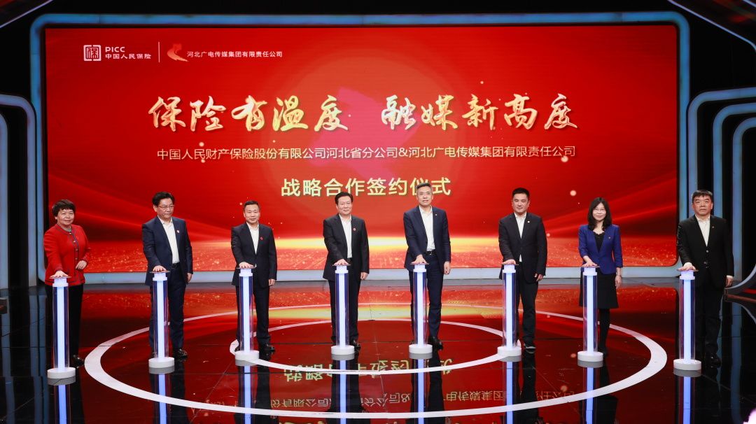 2月21日,河北广电传媒集团与中国人民财产保险股份有限公司河北省分公司战略合作签约仪式在400平米演播厅举办。省委宣传部副部长、台长武鸿儒,人保财险河北省分公司党委书记、总经理张巍出席。台(集团)总经理吉建英与人保财险河北省分公司党委委员、副总经理李玲分别致辞。人保财险河北省分公司领导杨轶麟、李彦君、张沄辰、温涛,台(集团)领导郑午阳、刘丽萍、刘晓梅、冀国锋,以及双方相关部门负责同志参加。