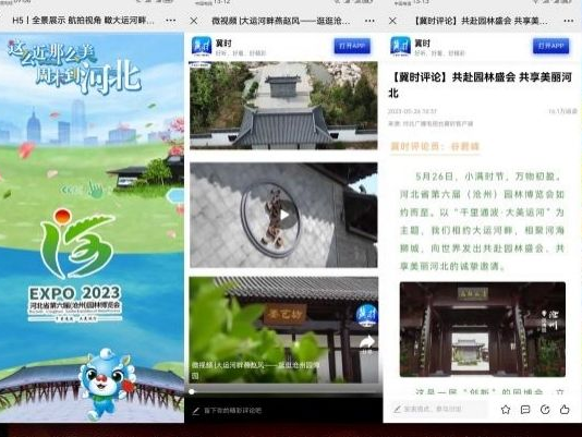 5月26日,河北省第六届(沧州)园林博览会开幕,新媒体中心策划制作《全景展示 航拍视角 瞰大运河畔燕赵风华》《大运河畔燕赵风——逛逛沧州园博园》等报道,通过H5、微视频、评论文章等形式,生动呈现博览会亮点设计,展现我省多个特色主题园林的生态人文之美。
