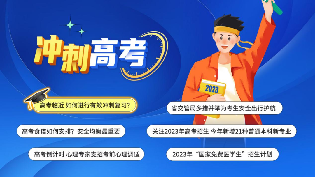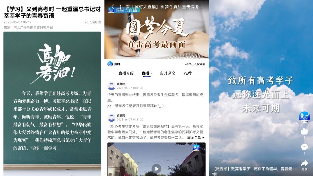 新媒体中心搭建《2023高考服务站》专题,集纳高考资讯、服务类等稿件超过60篇;制作《又到高考时,一起重温总书记对莘莘学子的青春寄语》《致高考学子:愿你不负韶华,青春无悔》等原创产品;推出图文直播《圆梦今夏!直击高考最画面》,立体呈现高考即景。