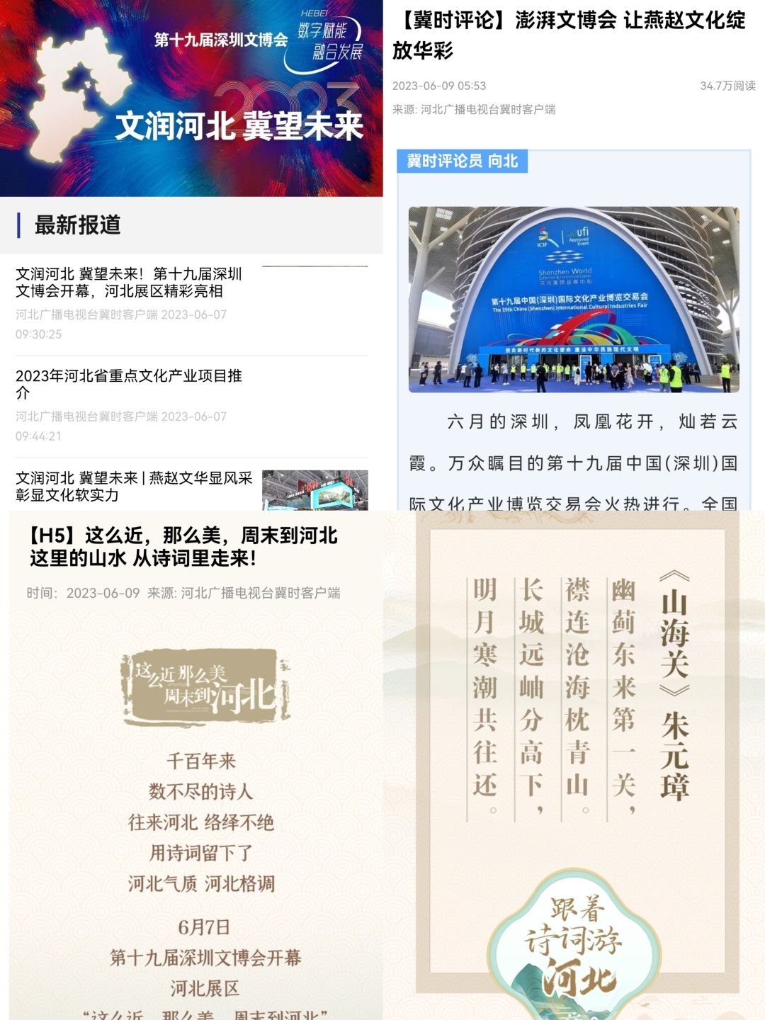新媒体中心在网、端搭建《文润河北 冀望未来——第十九届深圳文博会》专题,集纳台(集团)重点报道,发布图文稿件《文润河北 冀望未来!第十九届深圳文博会开幕,河北展区精彩亮相》;推出《这里的山水 从诗词里走来》《澎湃文博会 让燕赵文化绽放华彩》等报道,多角度呈现河北展区的亮点。