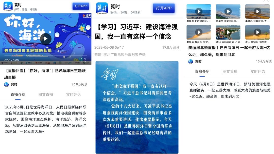 新媒体中心围绕“世界海洋日”,制作《习近平:建设海洋强国,我一直有这样一个信念》《海滨城市的惬意生活》等原创产品;推出慢直播《嗨!大海》《世界海洋日 一起云游大海》感受大海的浪漫与唯美。