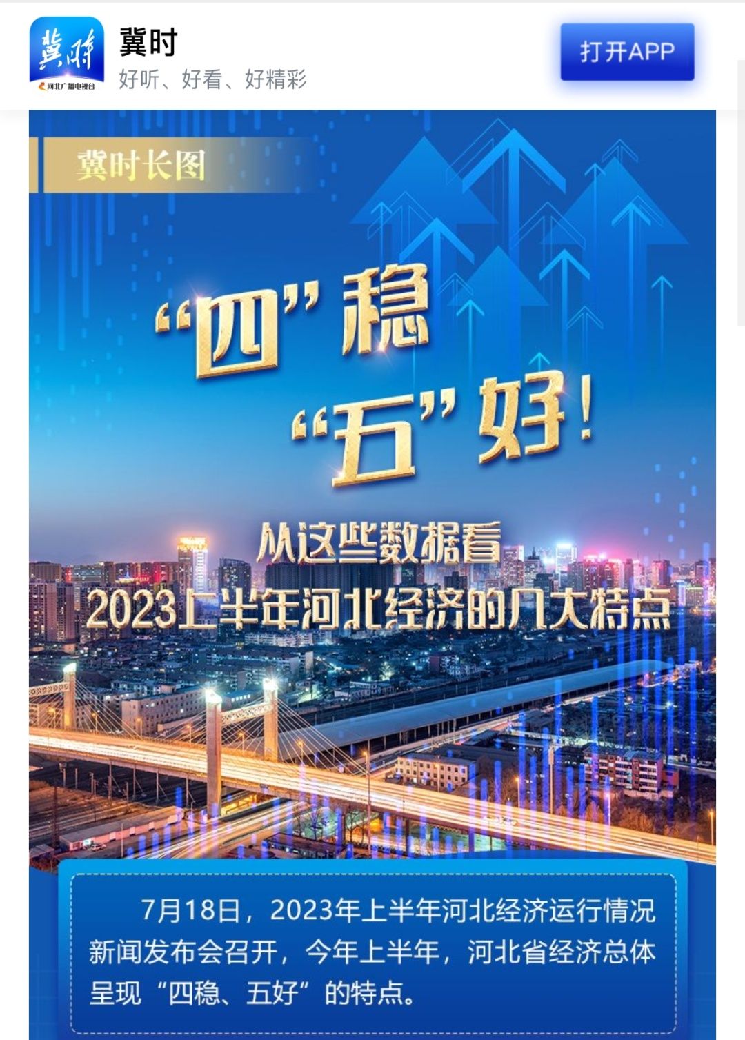 新媒体中心推出直播《2023年上半年河北经济运行情况新闻发布会》,策划制作《“四”稳“五”好!从这些数据看2023上半年河北经济的几大特点》《6.1%!稳中加固!稳中向好!2023上半年河北成绩单出炉》等图文、短视频,简洁、直观地呈现我省经济运行特点。