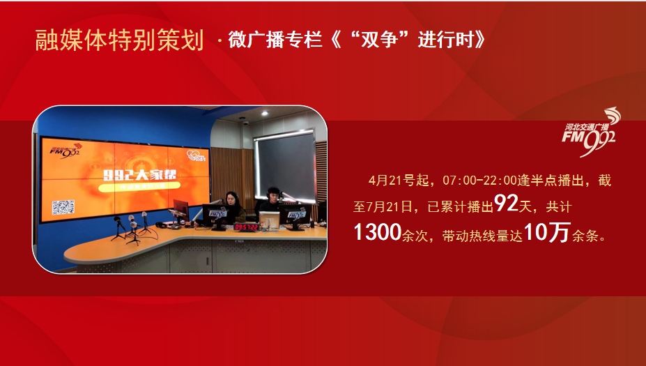 新闻频率群在《河北新闻》节目中开设《“双争”有我》专栏,在小程序、微博、视频号推出2场“石家庄市桥西区居民周末音乐”视频直播,丰富群众精神文化生活。