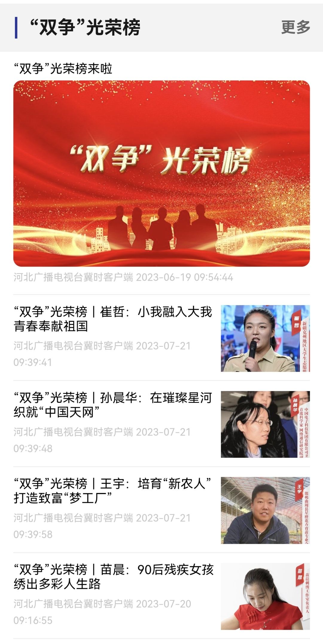 《河北新闻联播》节目开设《“双争”进行时》专栏,播发《“双争”有我——2023年6月“时代新人•河北好人”发布活动在邯郸举行》《张家口:文明花开新风来》等多篇稿件。