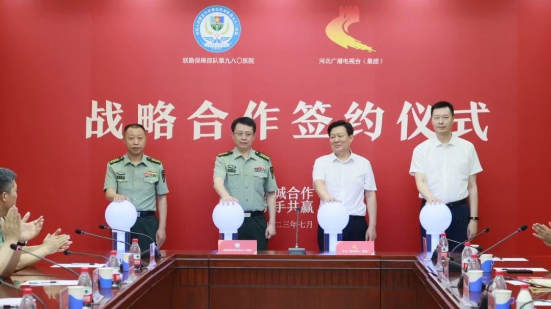 7月20日,台(集团)与联勤保障部队第九八〇医院战略合作签约仪式成功举行。省委宣传部副部长、台长武鸿儒,联勤保障部队第九八〇医院院长郑龙出席,台(集团)总经理肖钧、联勤保障部队第九八〇医院政委杨亚强分别致辞,副台长张洲参加。签约仪式后,联勤保障部队第九八〇医院一行参观了融媒体新闻中心。