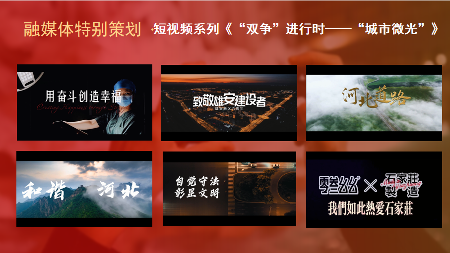 都市频道制作典型人物宣传片近百条,在户外大屏幕播出260条,策划推出互动产品240条,助力兴起全网参与热潮。其中,《庞伟:冠军不只是一种荣耀,更是一种责任》等多篇作品登上快手平台“本地榜”;创意变装短片《每个平凡人心中都住着一个英雄》被省委网信办全网推送,总浏览量超过500万。