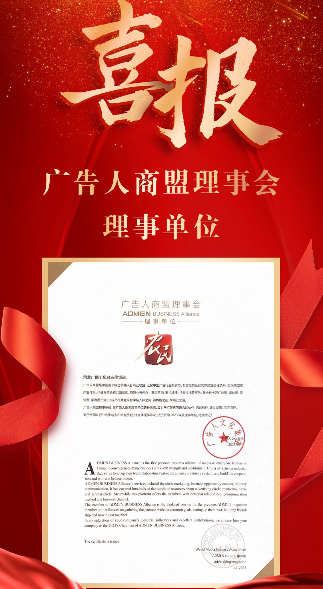 7月18日,在2023届媒企盛宴暨广告人商盟理事年度交流会上,农民频道荣获广告人商盟理事会理事单位荣誉称号。