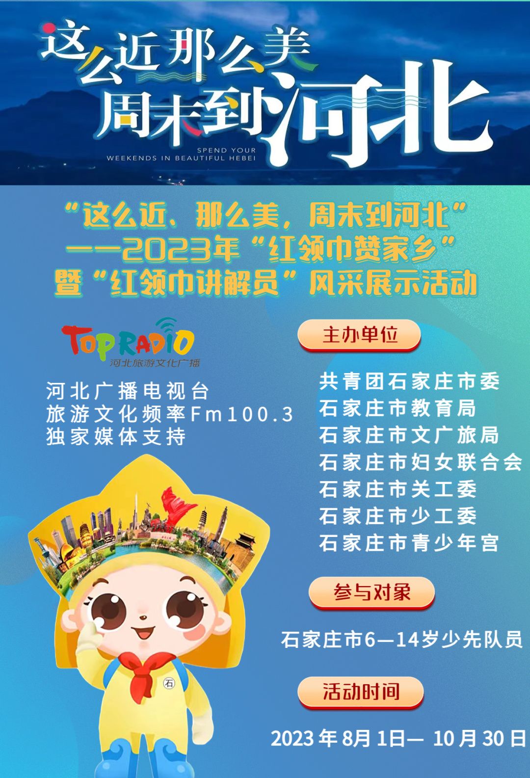 日前,生活频率群联合石家庄市多个单位举办的“这么近,那么美,周末到河北”2023年“红领巾赞家乡”暨“红领巾讲解员”风采展示活动正式开启报名通道。选手音频录制完成后,将在生活频率群进行展播。