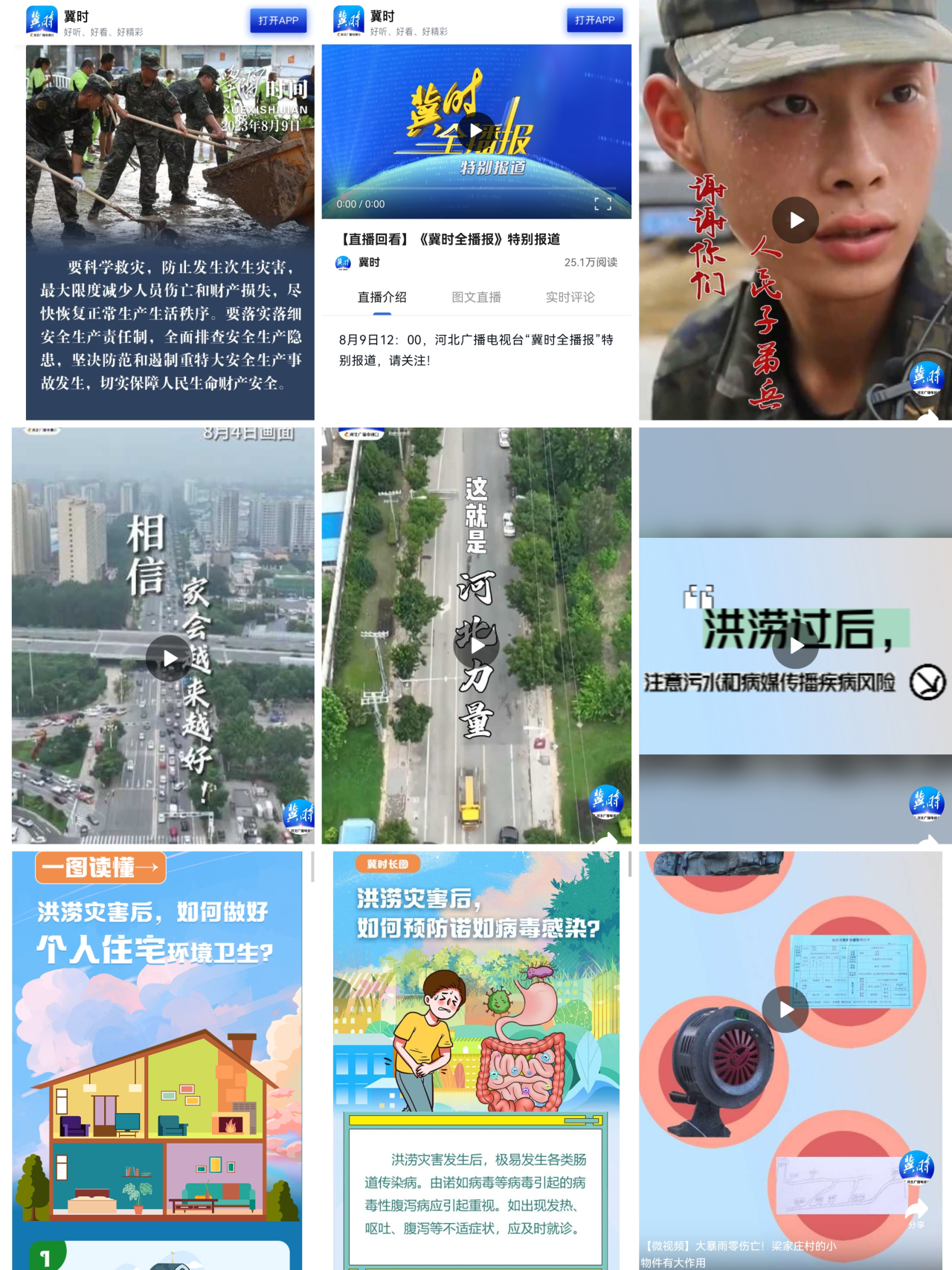 新媒体中心协同相关部门进行7场视频直播《“冀时全播报”特别报道》,发布直播碎片化短视频《记者探访涿州物资安置点:双向奔赴 爱心接力》《电力部门 风雨无阻 保障供电》等近70篇;策划推出《大暴雨零伤亡!梁家庄村的小物件有大作用》《这就是河北力量》等短视频;推出科普产品《洪涝过后,注意污水和病媒传播疾病风险》《汽车泡水了、被冲走了!该怎么办》等。