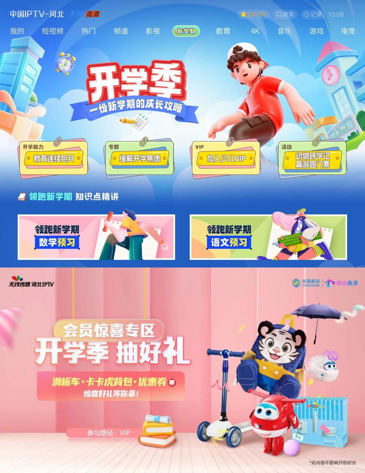 河北IPTV平台推出系列主题策划,大屏端上线“新学期”特色插屏;移动侧平台上线“开学季,抽好礼”会员福利活动。小屏端在“河北IPTV会员”微信公众号同步开展“开学季”微信留言有礼活动。