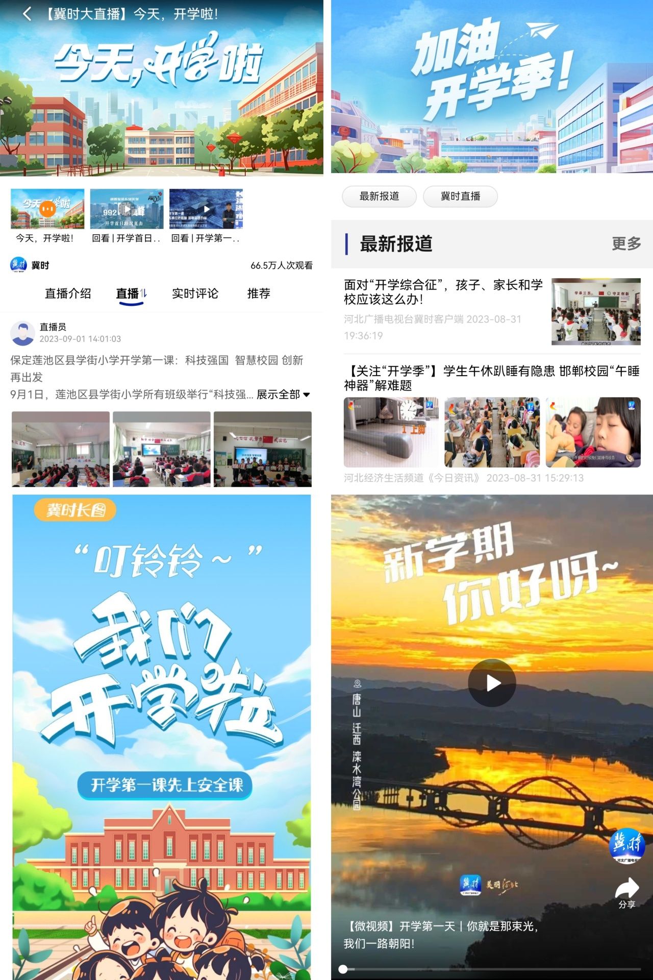 9月1日,新闻频率群联合“冀时”客户端和各地市台,推出“开学季”特别直播。7路记者实地探访石家庄、邢台、张家口等地多所具有代表性的学校,聚焦“开学第一课”主题,从灾后重建、乡村振兴、红色文化、传统文化、安全教育等方面,以图文、视频形式,展现新学期的新气象。