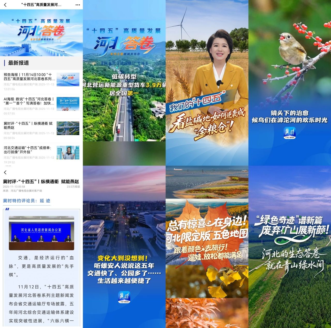 新媒体中心在网、端、“冀时”第三方平台进行“十四五”高质量发展河北答卷系列主题新闻发布会直播,并为省内媒体提供发布会直播信号及技术保障;在首页首屏开设发布会专题,集纳推出《发布会预告》《AI海报·数说“十四五”河北答卷》《我们的“十四五”》《冀时评·“十四五”》《“十五五”我的小目标》等相关产品报道155篇,其中2篇次稿件被中央网信办全网推送,62篇被省委宣传部、省委网信办全网推送。