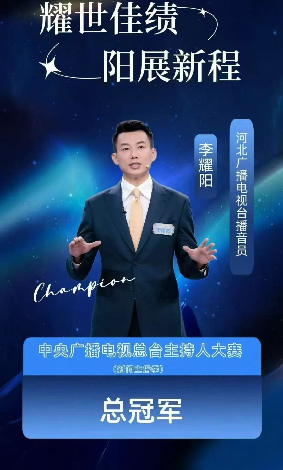 11月14日晚,在中央广播电视总台主持人大赛(新闻主播季)总决赛中,我台新闻主播李耀阳发挥出色,凭借稳健的台风、深刻的评论和出色的临场应变能力,在总决赛三轮比拼中均斩获最高分,以绝对优势摘得本届大赛金奖桂冠。
