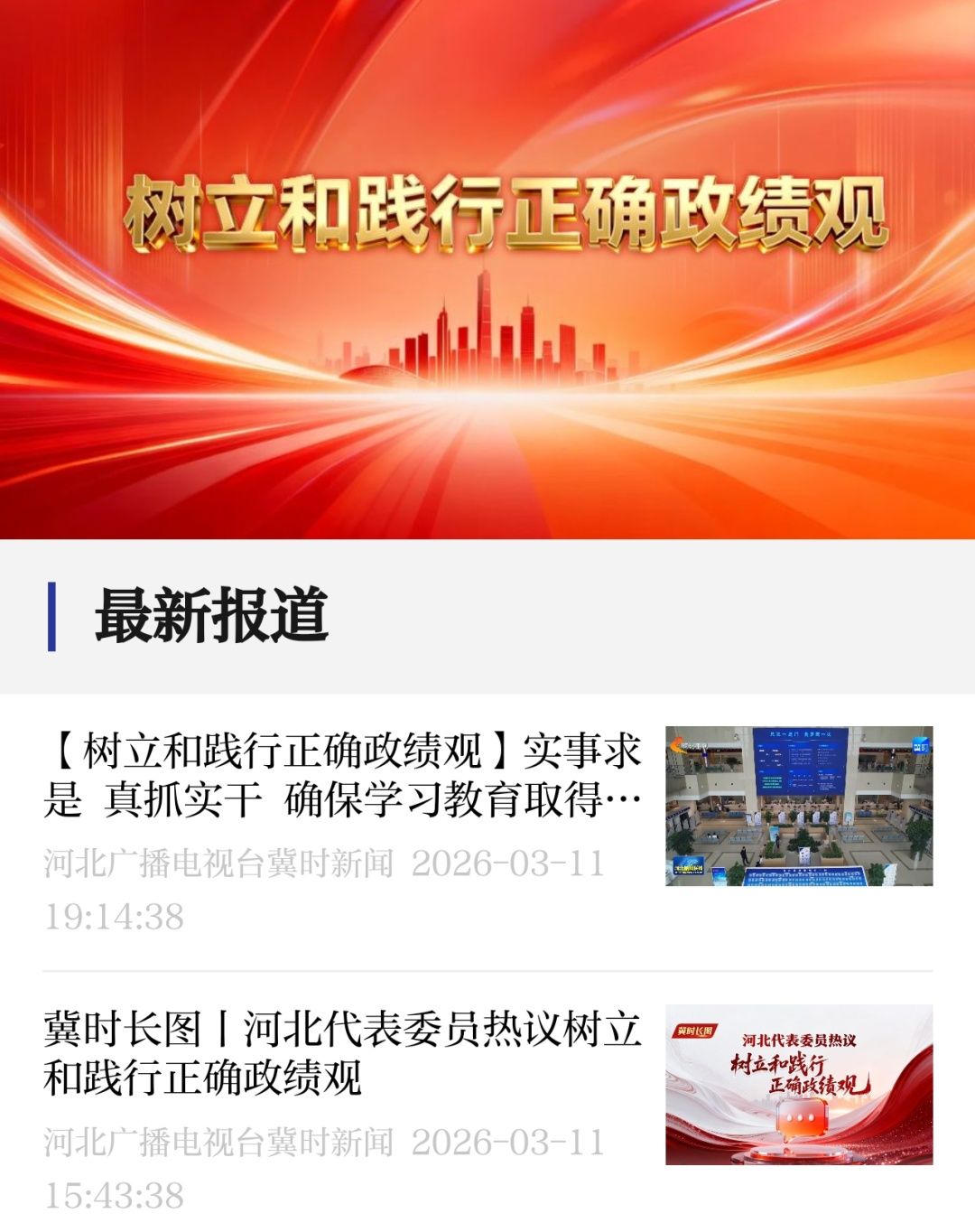 围绕“树立和践行正确政绩观”宣传,新媒体中心在网、端开设专题《树立和践行正确政绩观》,集纳融媒报道;制作推出《正午学习时间|带头树立和践行正确政绩观》《冀时长图丨河北代表委员热议树立和践行正确政绩观》等融媒产品。